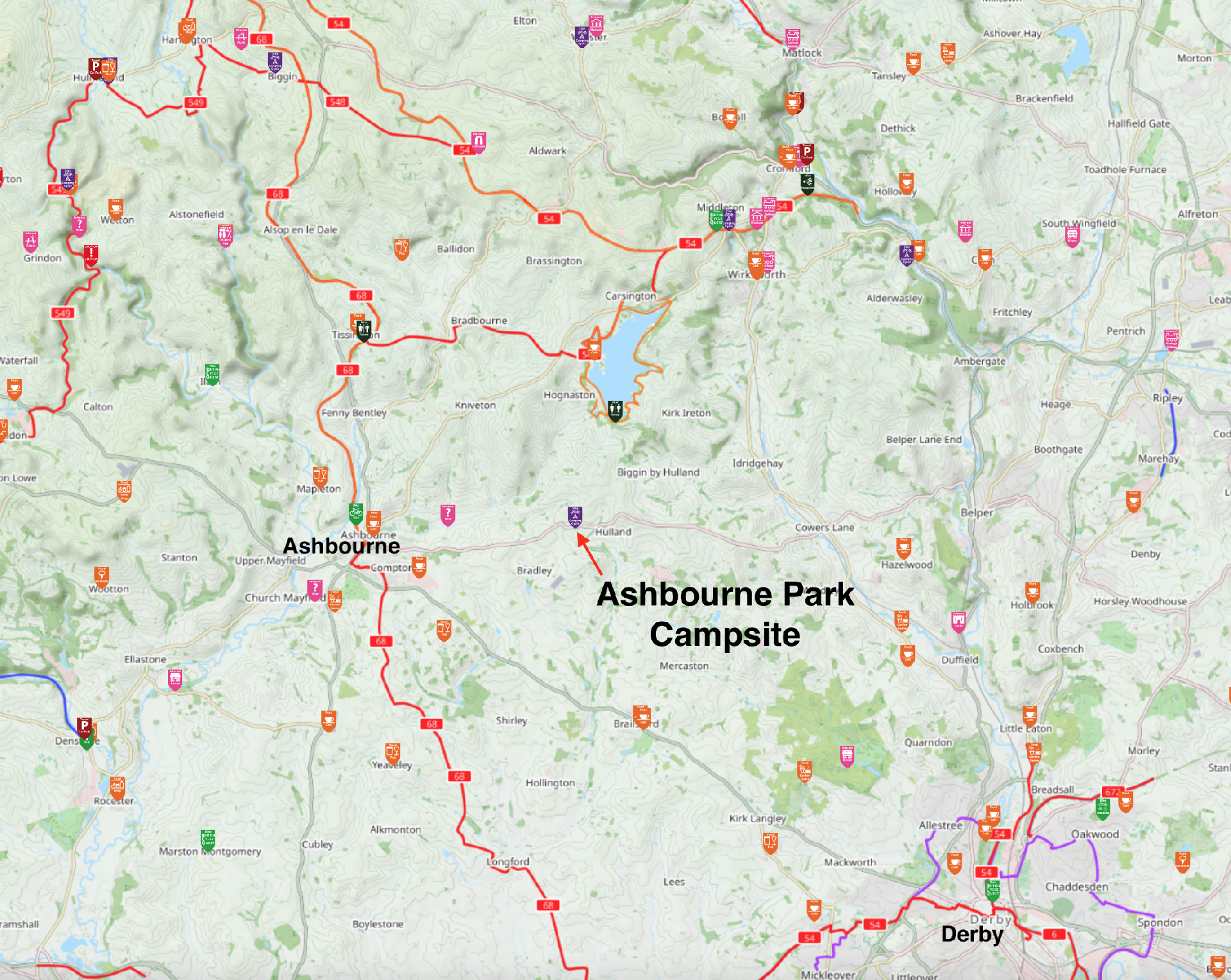 The rally will be based at Ashbourme Park Campsite to the east of Ashbourne. This popular site is normally fully booked over the Easter period but the club have been granted exclusive access to bookings until mid November 2025. If all the 70 pitches are taken then the site will be full of tandems. The campsite is flat except for 2 tent pitches that slope slightly, there are 36 hard standing with electric, 26 grass with electric, 6 grass without electric and 2 grass pitches with electric that are slightly sloping for tents. There are showers, toilets and a wash up area. There is WIFI but visitors report this as slow, but you'll be on your tandem during the day and in the marquee in the evening. Karen who manages the site rides a tandem and is looking forward to the clubs visit.