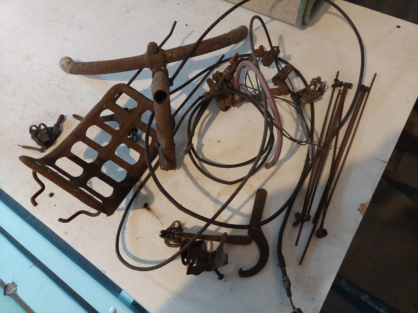 The wheels and K5 Sturmey Archer 3-speed hub brakes/gears have been completely rebuilt at considerable expense (including spraying some £500) and the rest stripped in preparation for spraying/renovation. The celluloid mudguards have no splits or crack and just need polishing – the associated staying and fixings have been removed but are all included in the sale. The drops are original and have a dent at the top which will need filling before paint.