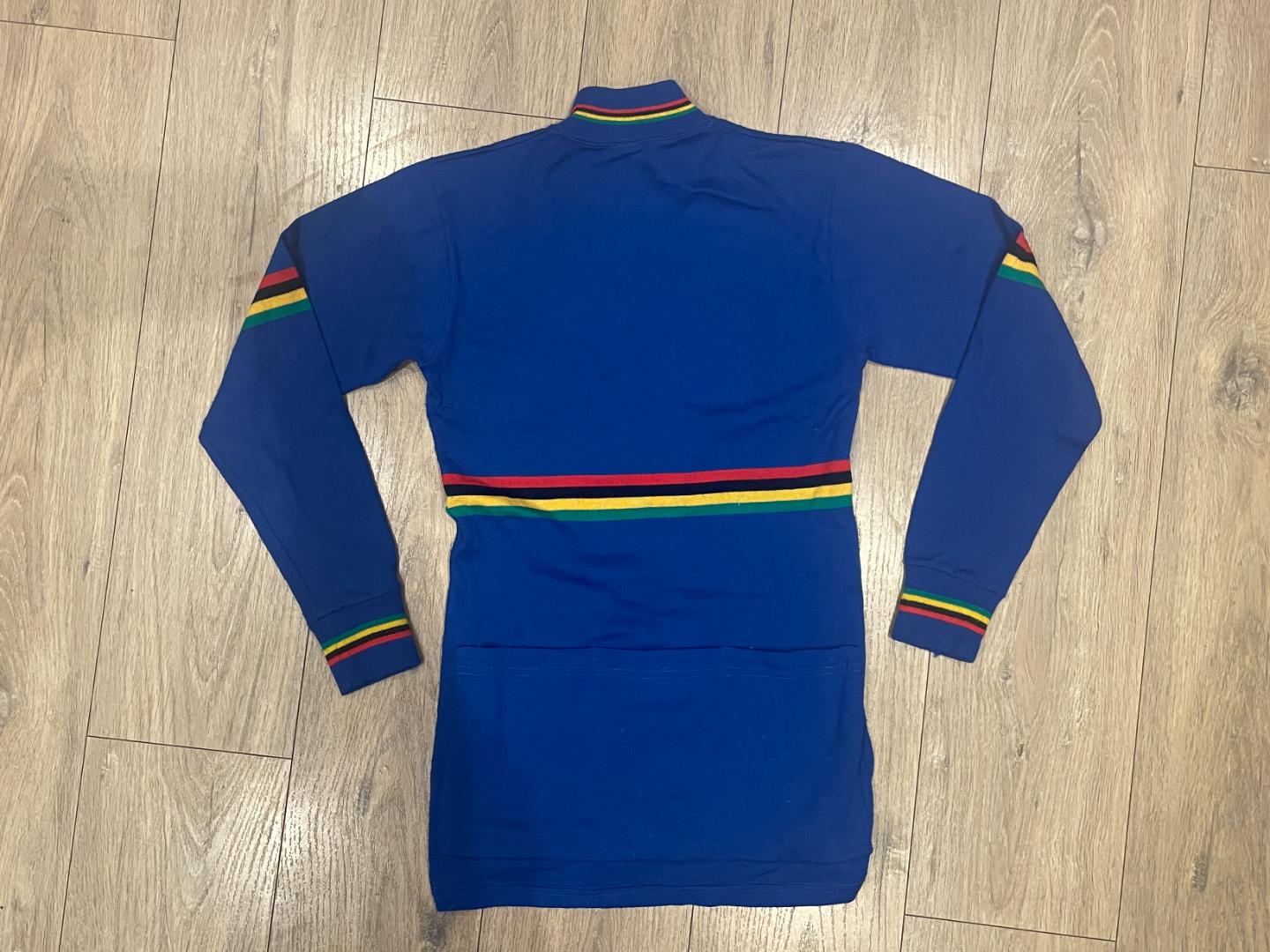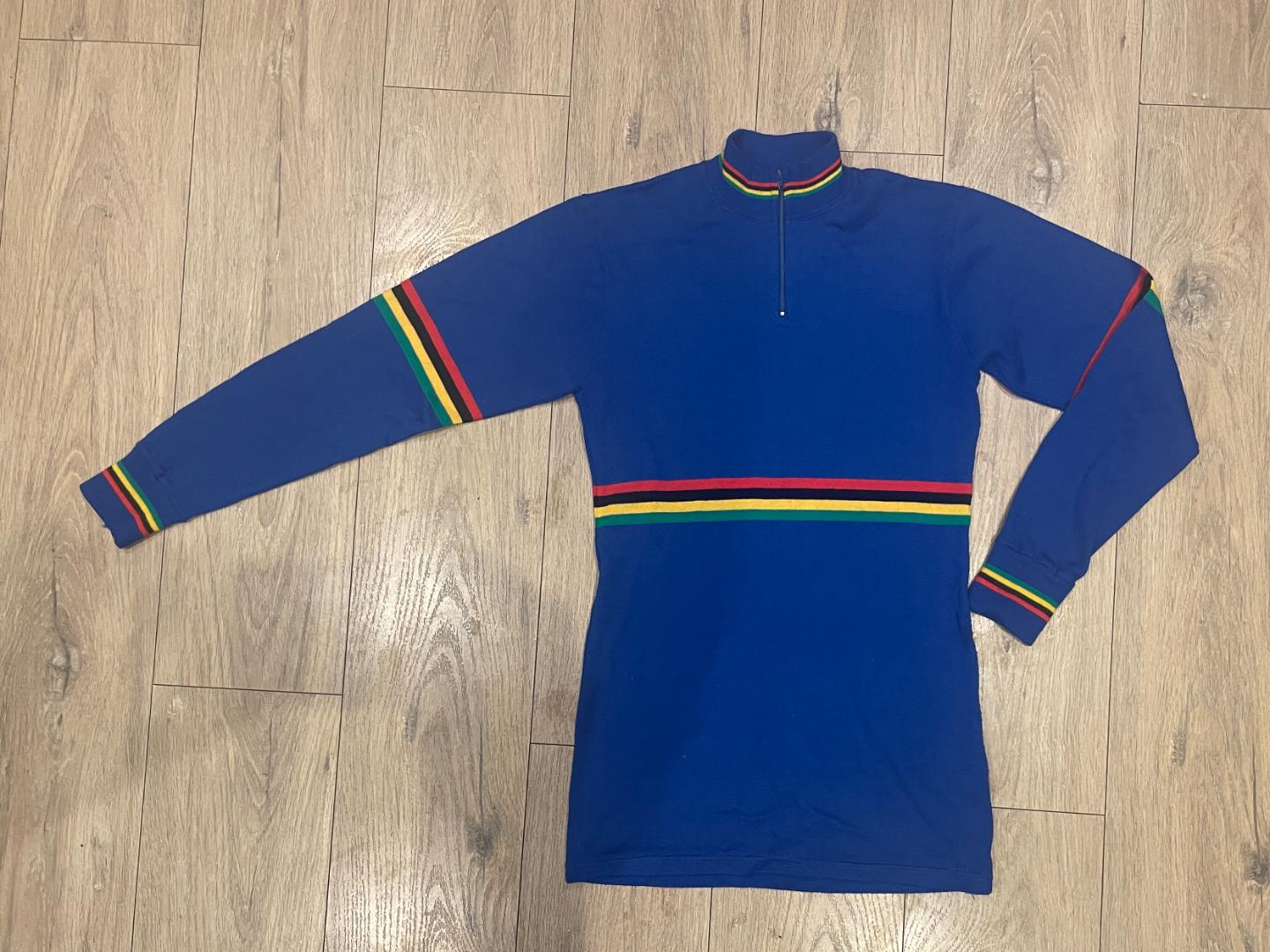 Blue with world champ colours band around chest, neck, sleeves and cuffs