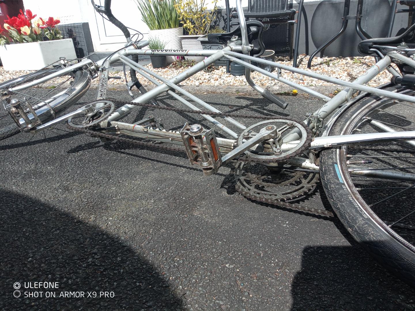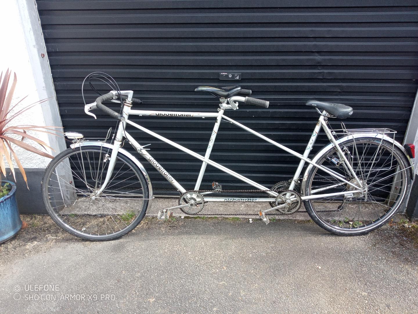 By: Mark Attwell/br>Id: 1656/br>Email: (Login to view)/br>Telephone: (Login to view)/br>Location: Saundersfoot, Pembrokeshire/br>Listing ends on: Sunday 5th July 2026/br>Price: £220/br>1980s vintage Globetrotter tandem in very good condition. I believe that these Reynolds 531 frames were built by the French company Follis, imported into the UK and rebadged. Seat tube heights are approximately; front 60cm, rear 57cm. I am 5’8”, my wife is 5’2” and we found it comfortable to ride. There is plenty of adjustment for taller riders.