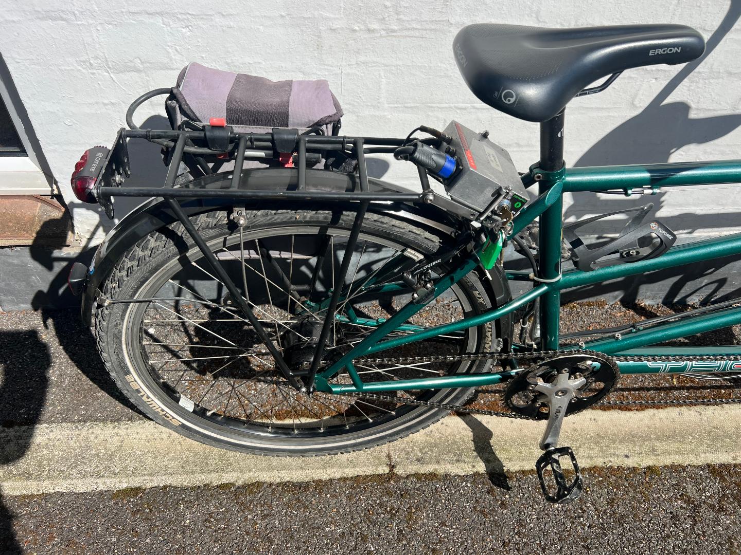 - Low mileage – probably no more than 3,000 altogether. Still on the original Shwalbe Marathon XR tyres showing little wear. Not used for the last 2.5 years since we bought a Circe Helios for lower stepover (riders getting older)