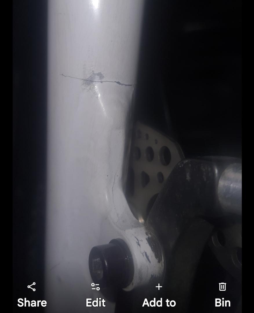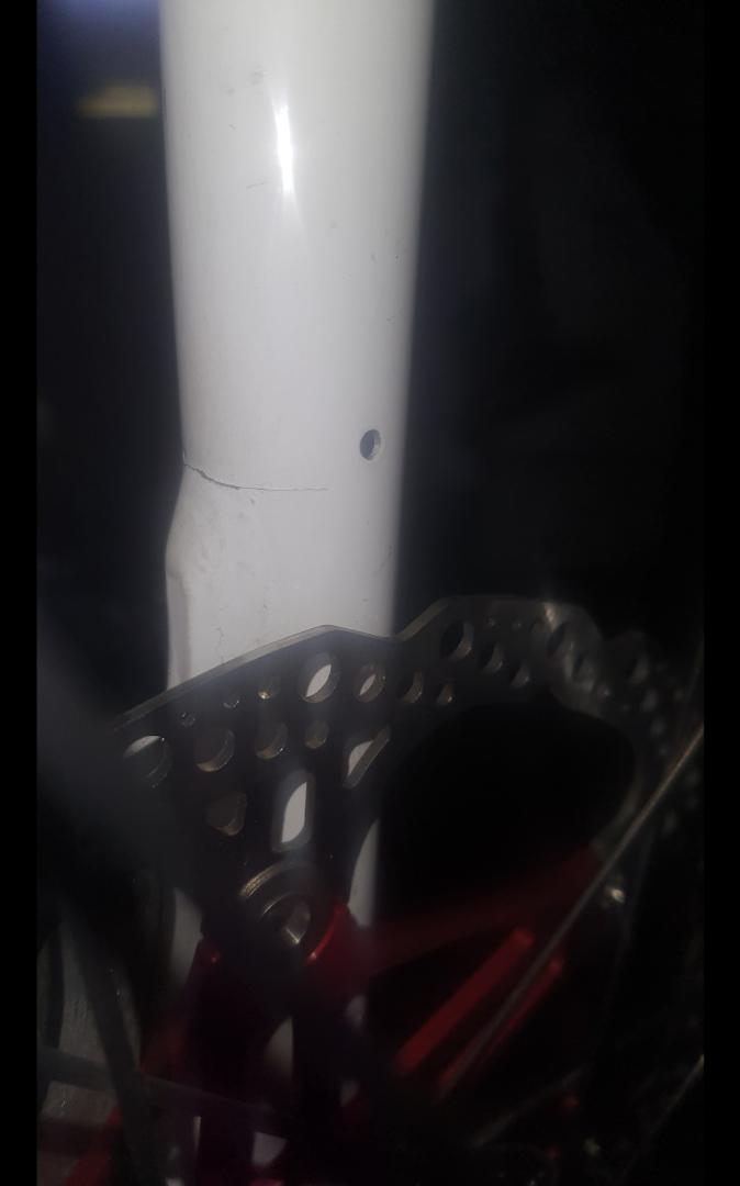 I was changing my disc pads and rotor this evening and noticed a stress fracture to my Cannondale fatty fork. There appears to be a crack spreading bilaterally from the upper edge of the IS disc mount involving about 180 degrees of the tube. I'm visually impaired but fortunately this was quite evident to touch which is how I noticed it. The front brake had developed a screach and judder, I was going to change the pads and rotor but I am guessing this is more likely the cause of the problem.