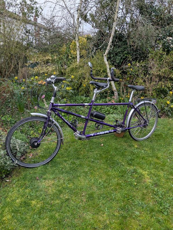 By: PAUL GREEN/br>Id: 1631/br>Email: (Login to view)/br>Telephone: (Login to view)/br>Location: TIPTREE/br>Listing ends on: Saturday 13th June 2026/br>Price: £750/br>Thorn Adventurer foldable tandem. It has been fitted with a Cytronex motor, and has a new battery as well as one that works still but is not so efficient. To fit 5'9 - 5'11 front, and 5'3- 5'5 rear, approx. There is an addition drum brake for the stoker.