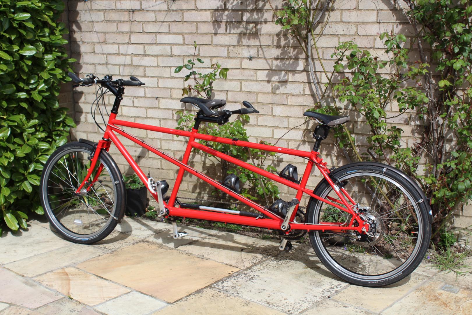 By: Paul Meadows/br>Id: 1675/br>Email: paul.meadows@outlook.com/br>Telephone: 07871158525/br>Location: Colchester/br>Listing ends on: Sunday 19th July 2026/br>Price: £1250/br>New from SJS in 2013 this tandem is immaculate and comes powder coated in red. Fitted with Hope Hydraulic disc brake to the rear, DX rim brakes with friction shift to the rear and DX lever to front. Roholoff 14 speed Hub Gears, Thudbuster seat post for stoker. New Schwalbe Marathon plus tyres. May be able to help with delivery.